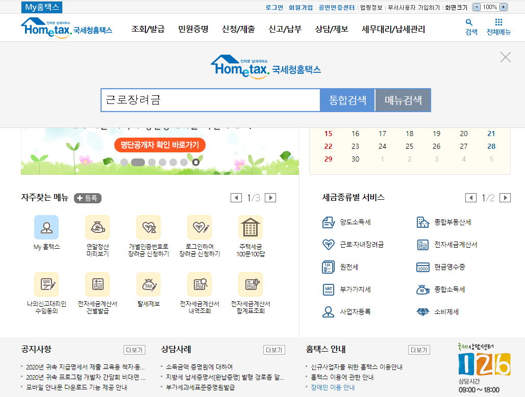 검색창에 ‘근로장려금’을 검색 한 뒤 근로장려금 계산해 보기를 선택한다. 신청요건과 연간 총 급여액을 성실하게 입력한 뒤 확인 버튼을 누르면 예상 근로장려금을 확인할 수 있다.